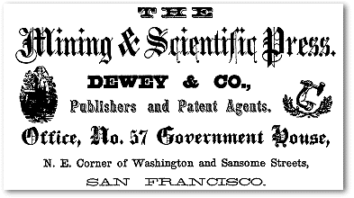 The publication of the Mining and Scientific Press was originally undertaken by Messrs. George H. Winslow & Co., the first number appearing May 24th 1860. It was subsequently conducted by J. Silversmith. In October, 1862, Mr. Warren B. Ewer purchased the entire office, and, as editor and proprietor, conducted the journal until January 1st, 1863, at which time he disposed of one-half interest to Mr. C.W.M. Smith, and the firm of Ewer & Smith continued to the 1st of December, 1863, when Mr. Alfred T. Dewey became interested in the business, and the firm changed to DEWEY & Co. On the 2nd of January, 1864, the Press appeared in a "new dress," enlarged to sixteen pages, just double its former proportions, which important improvement secured for it a high degree of favor and increased consideration, and its subscription and advertising patronage has since constantly increased among the sterling members of the mining and mechanical community of this coast. Again, on the commencement of the present volume No. IX., its pages have been enlarged, and now contain sixty-four columns. The need of a first class journal devoted especially to the encouragement of practical scientific industry, in San Francisco, is apparent. No persons are more fully aware of this fact than the Publishers of the Press, who have determined to devote all their energies to the production of a journal every way worthy of its position, and in harmony with the advancing spirit of the times. The PATENT AGENCY of the Mining and Scientific Press has been signalized with remarkable success during the past two years. The importance to the inventive genius of this coast of a thorough and reliable agency for the solicitation of LETTERS PATENT from the United States and foreign Governments cannot be over-rated, and the Proprietors of the Press, feeling the responsibility which rests upon them, and the reward which must naturally follow the faithful performance of their trusts, will take care to afford inventors every advantage to be secured to them through a competent and responsible agency upon this coast. July 1st, 1864 In: San Francisco business directory and mercantile guide for 1864-65 : A general business directory for all persons throughout this state; also, oregon, nevada territory and Mexico / Pub. by B.F. Stilwell & Co. San Francisco : Agnew & Deffebach, 1864. |